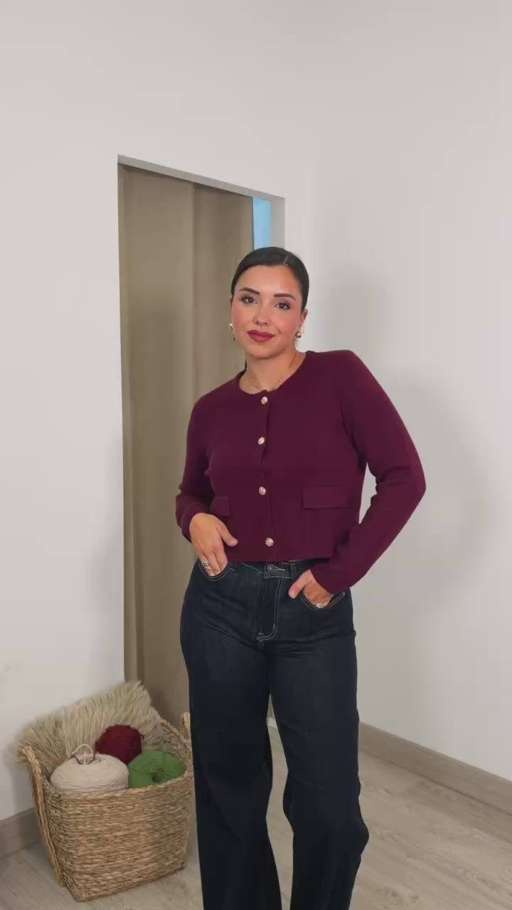 Cárdigan con botones metálicos y bolsillos decorativos. Textura cálida.