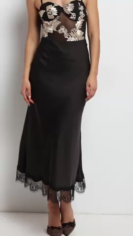 Falda midi satén con terminación de encaje a tono. Caída fluida y brillo sutil.